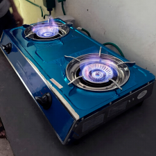 Fogão a biogás de dois queimadores, ideal para cozinhas familiares ampliadas, escolas, refeitórios e unidades institucionais que demandam maior capacidade de cocção com biogás.